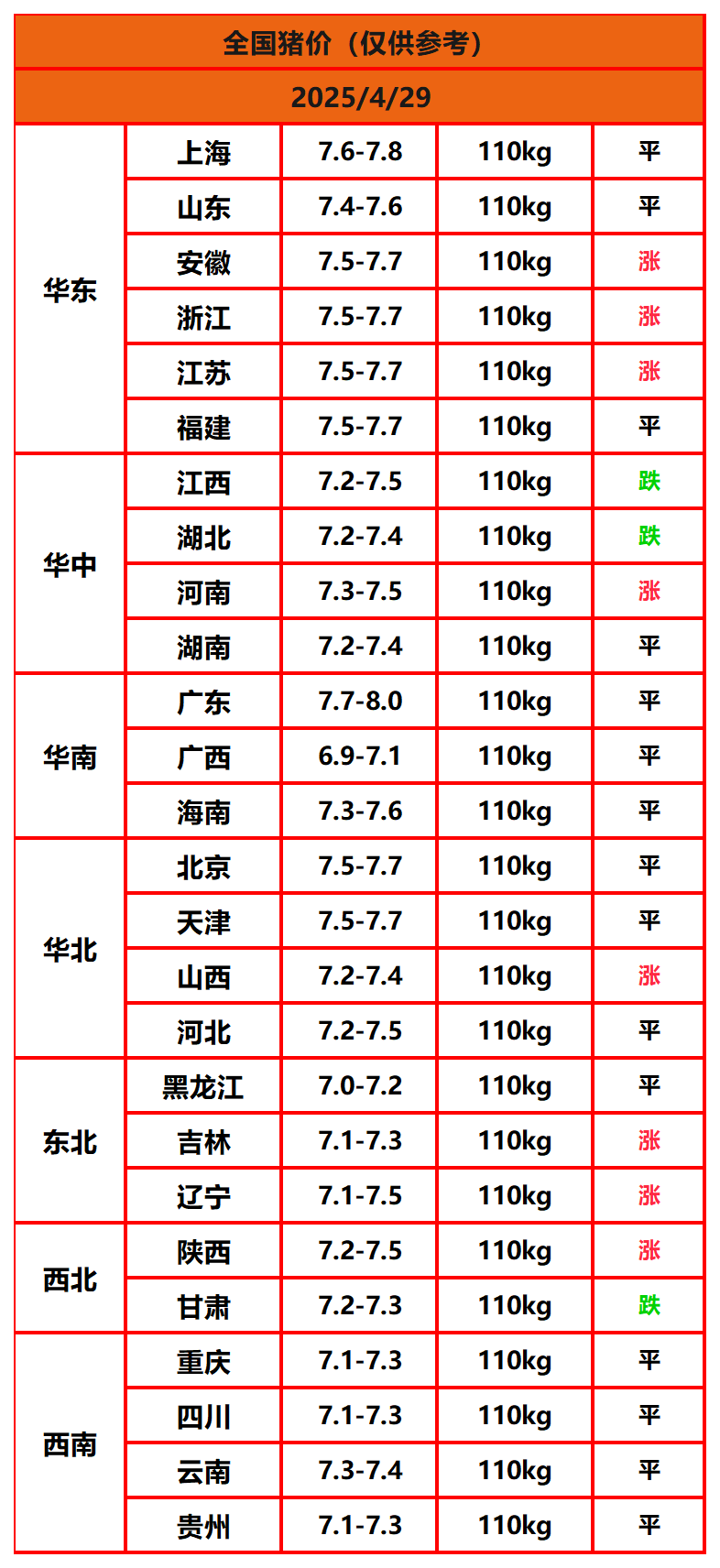 2025年4月29日猪价,今日全国猪价行情走势:8涨15平3跌。