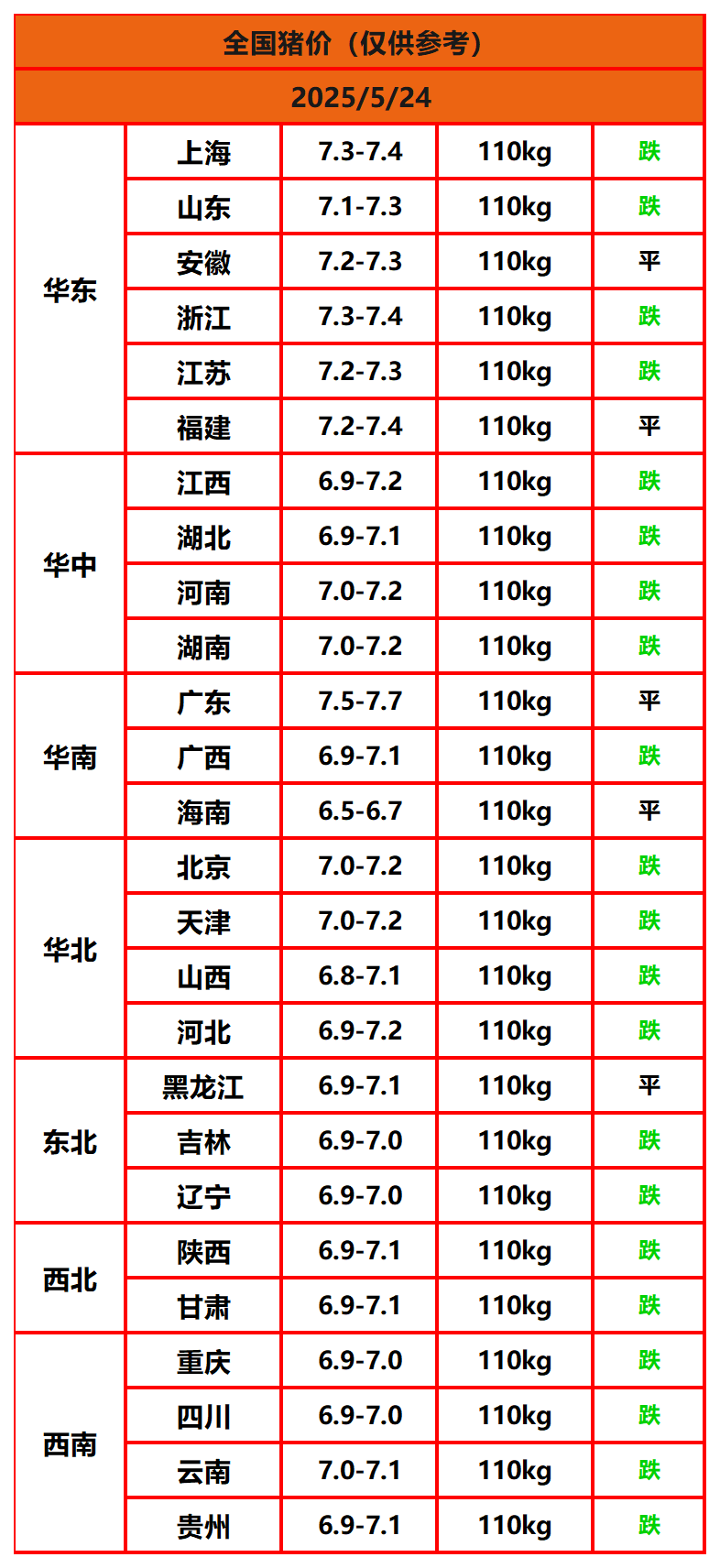 2025年5月24日猪价,今日全国猪价行情走势:0涨5平21跌。