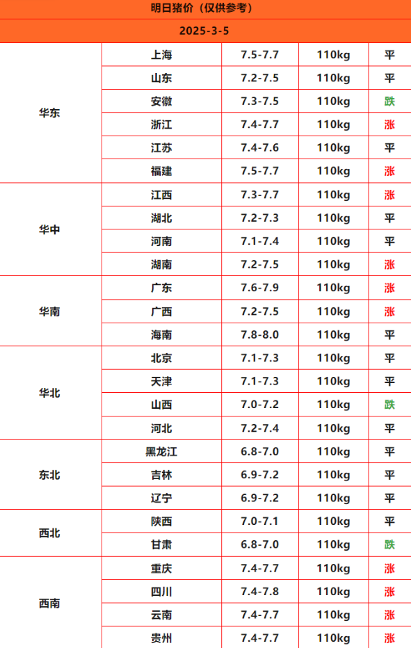 2025年3月5日猪价,今日全国猪价行情走势:10涨13平3跌。